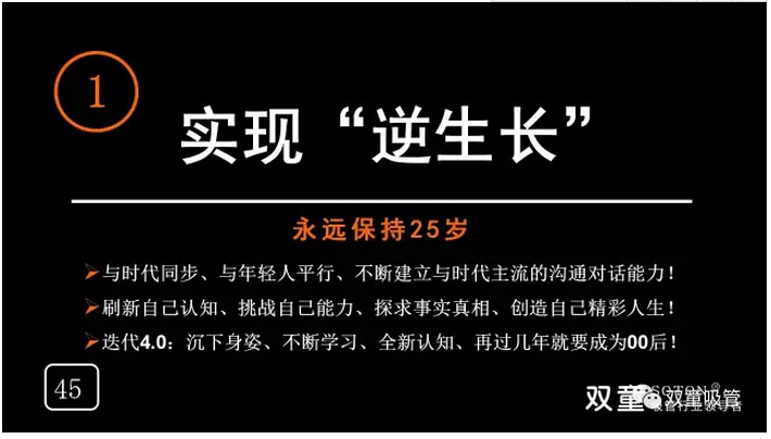 未來已來,“雙童”樓仲平在面對(duì)這個(gè)瞬息萬變的現(xiàn)代信息社會(huì)時(shí),充滿了緊迫感和進(jìn)取心,他意識(shí)到唯有持續(xù)學(xué)習(xí)、不斷改變才能緊跟時(shí)代發(fā)展,唯有嘗試新的突破,轉(zhuǎn)變自己的思維,永遠(yuǎn)將自己定位在25歲,才能完成下一次向00后的迭代,從而影響團(tuán)隊(duì)并保證“雙童”不被時(shí)代所淘汰!