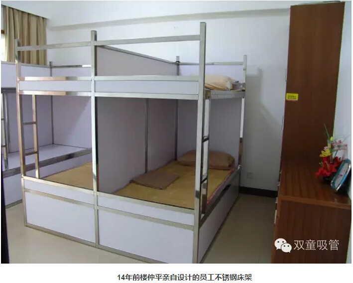 再來(lái)看看“雙童”最典型的不銹鋼床架,這可是所有參觀團(tuán)隊(duì)來(lái)參觀后最津津樂(lè)道的話題之一!這些床架都是由“雙童”樓仲平親自設(shè)計(jì)后,找最好的不銹鋼焊造而成。為了保證衛(wèi)生和安全,我們?cè)诮ㄔ熘蹙鸵呀?jīng)把床架焊在地上,確保員工在生活方面的便利舒適,讓員工更加放心工作!