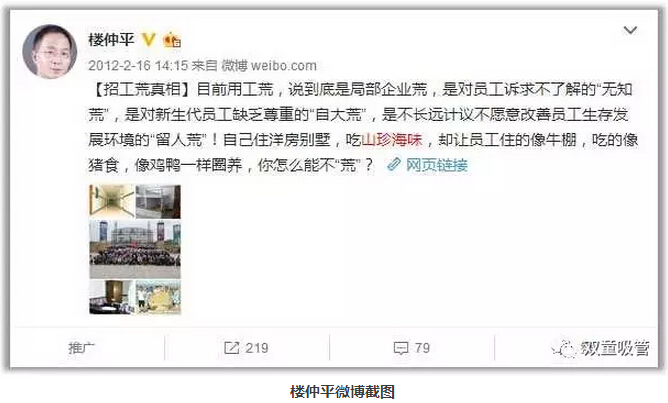 其實(shí),“雙童”樓仲平由于早年坎坷辛苦的創(chuàng)業(yè)經(jīng)歷,一直對(duì)農(nóng)民工感同身受,十分注重員工的吃住問(wèn)題。早在2012年,樓仲平就發(fā)布了一條關(guān)于員工住宿的微博,引起了極大的關(guān)注。微博上寫(xiě)道:自己住洋房別墅,卻讓員工住的像牛棚狗窩,你怎么能留得住員工?員工是企業(yè)的基礎(chǔ),對(duì)員工更好、企業(yè)反而會(huì)獲得更多!