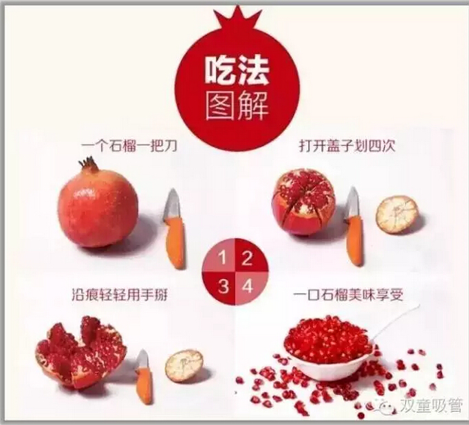 石榴可謂全身是寶:葉子可止瀉、皮曬干可補血養(yǎng)氣,還有疏肝柔肝、寧心定志的作用呢!石榴的寓意更是美好,有著紅紅火火、多子多孫的寓意!要說石榴的剝法,吸管妞做為專業(yè)吃貨,自然有妙招!快戳下圖↓