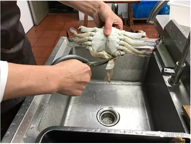 12、取出砂囊后將蟹身兩側(cè)的蟹鰓(看上去像魚鰓)用手工拔除干凈,如果蟹鰓底部有烏黑砂子,千萬不要用清水沖洗,用干凈牙刷局部清洗一下就可以了。