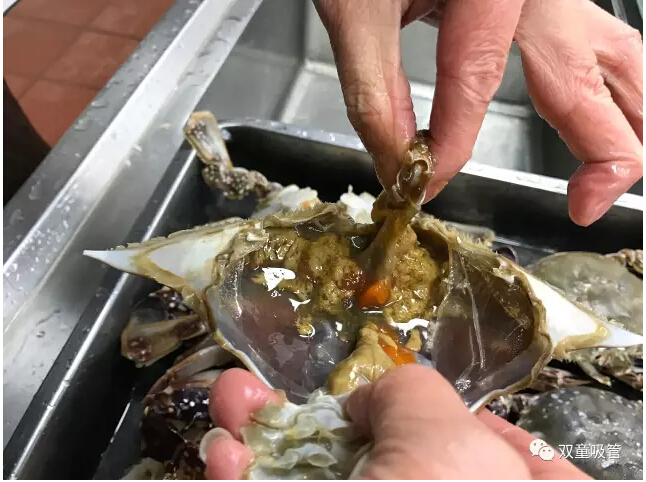 11、一般情況下砂囊會隨膏體粘在蟹殼的嘴部,也可能在隨膏體粘在蟹身嘴部,反正一定要找到取出!