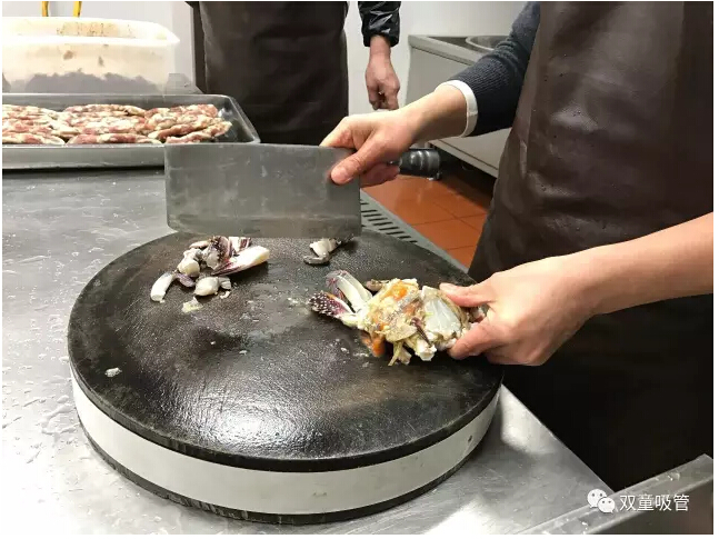 13、螃蟹宰殺完畢后放菜板將蟹腳去除,大腳砍成三段、小腳砍成兩段。