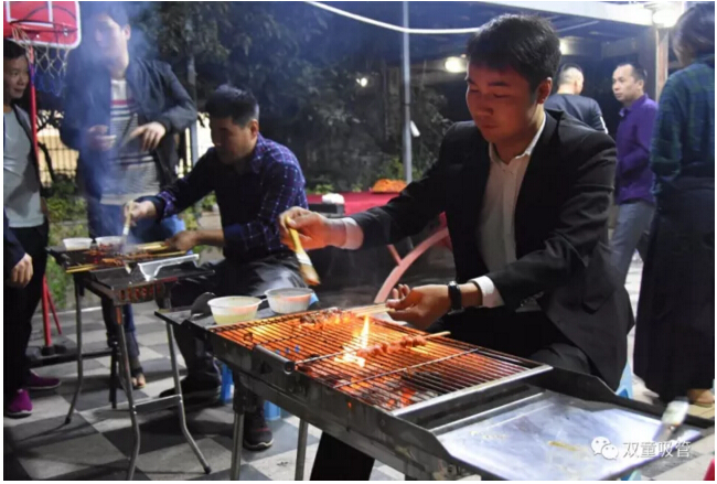 大家圍坐在烤爐前自助燒烤,看這手法,一個個架勢十足,烤翅要割刀“一刀、一刀、又一刀”,年糕要烤得軟硬適中,烤肉追求香嫩可口,辣椒、孜然粉用起來得心應(yīng)手,骨肉相連,串串入味……大家都戲稱:咱們都是專業(yè)燒烤20年!