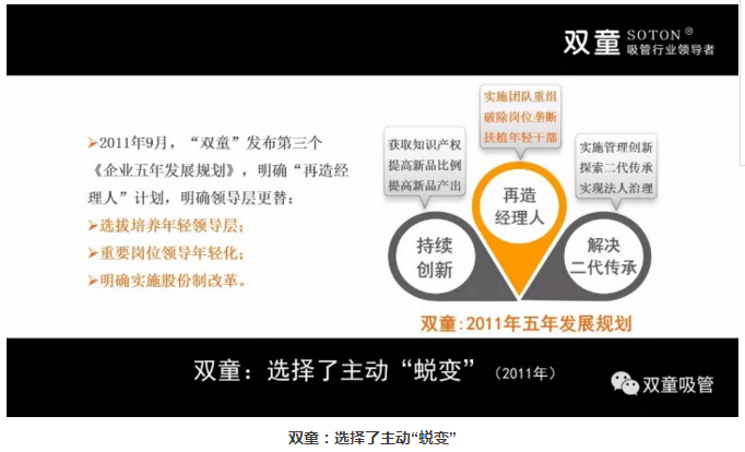 公司創(chuàng)辦初期聘任部分原國營企業(yè)的下崗管理層,這些人客觀上在企業(yè)發(fā)展中做出了巨大的貢獻。但2010年前后,其中的大部分管理層逐漸出現(xiàn)了“認知時間軸瓶頸”,他們完全憑經(jīng)驗用老方法解決新問題,拒絕接受和應(yīng)用新興事物,團隊的成長遇到了瓶頸。因此,“雙童”決定重新梳理團隊,在2011年發(fā)布了第三個《企業(yè)五年發(fā)展規(guī)劃》,明確“再造經(jīng)理人”計劃,明確領(lǐng)導(dǎo)層更替:選拔培養(yǎng)年輕領(lǐng)導(dǎo)層、重要崗位領(lǐng)導(dǎo)年輕化、明確實施股份制改革,慢慢解決管理層老化問題!重組后的“雙童”團隊平均年齡不到三十歲,大部分核心團隊的工齡在十年以上,學(xué)歷、知識層次和忠誠度大幅提高!