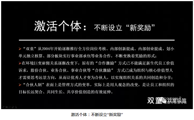 激活組織的同時,“雙童”也在激活個體上絞盡腦汁,不斷設(shè)置“新獎勵”。公司從2004年開始逐漸推行全方位崗位考核、內(nèi)部創(chuàng)新提成、內(nèi)部創(chuàng)業(yè)提成、劃小單元獨立核算、部分板塊實行事業(yè)部承包等業(yè)務(wù)合作,不斷變換著獎勵的形式。同時,股份合伙、業(yè)務(wù)合伙、事業(yè)合伙等“合伙激勵” 方式已成為組織與核心價值型人才需要思考遠景方向,從而讓優(yōu)秀人才變?yōu)楹匣锶?,以實現(xiàn)組織關(guān)系的共同創(chuàng)造和分享!