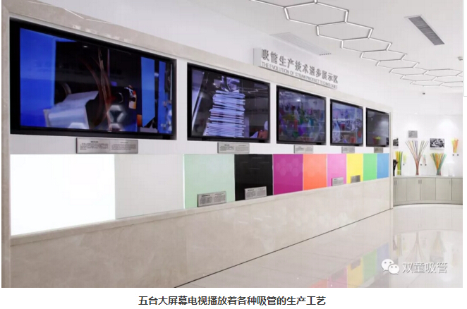 由于現(xiàn)代塑料吸管的生產(chǎn)設(shè)備過于龐大,不能一一將設(shè)備陳列在博物館現(xiàn)場。所以在吸管生產(chǎn)技術(shù)展示區(qū)內(nèi)采用了五臺三星55寸大屏幕電視用于展播各類吸管的生產(chǎn)工藝。每臺電視機(jī)各播放一種吸管的生產(chǎn)工藝,大家在觀看的過程中能非常直觀的感受到現(xiàn)代吸管的生產(chǎn)技術(shù)和生產(chǎn)工藝。
