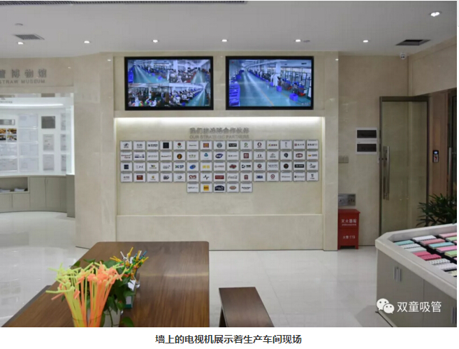 >>> 在“雙童”吸管產(chǎn)品陳列廳的墻面上有兩臺大屏三星液晶電視連接著車間的監(jiān)控端,讓客戶在不進(jìn)入車間的前提下也能了解到“雙童”的車間生產(chǎn)狀況;